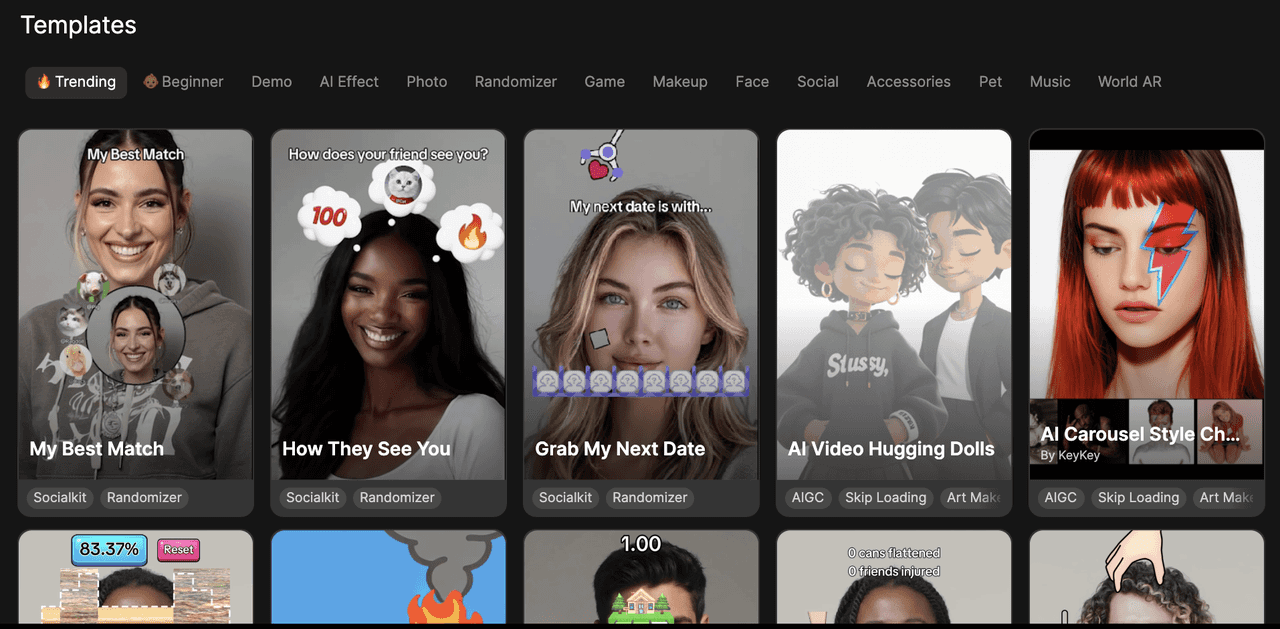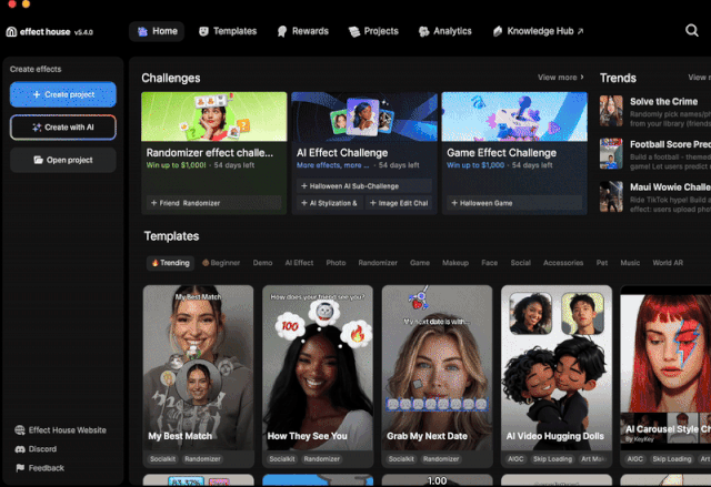 • You can now enter challenges directly from the Challenges section on the Effect House homepage, making it easier to participate and start creating effects right away. You can also select templates that take you straight into Create with AI with trending effect topics and pre-filled prompts.