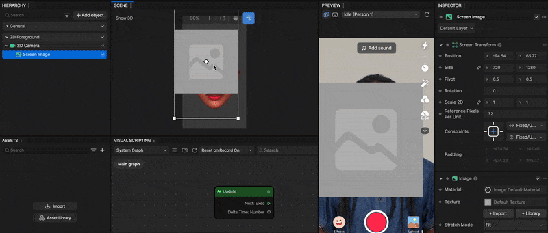 • New 2D system in the Hierarchy panel. Updates include the following:Screen Image replaces the current Image object. It consists of the new Screen Transform component and Image component. It is displayed and edited in the 2D scene view by default.Image has been updated to use 3D TransformFace Sticker has been updated to use the new Image componentSegmentation objects have been updated to use the new Screen Transform component instead of the 2D Transform, Canvas, and Canvas Scaler components to achieve the same effect2D Scene Object creates a new generic scene object that can function as a parent or base entity for new 2D objects with the Screen Transform component.
